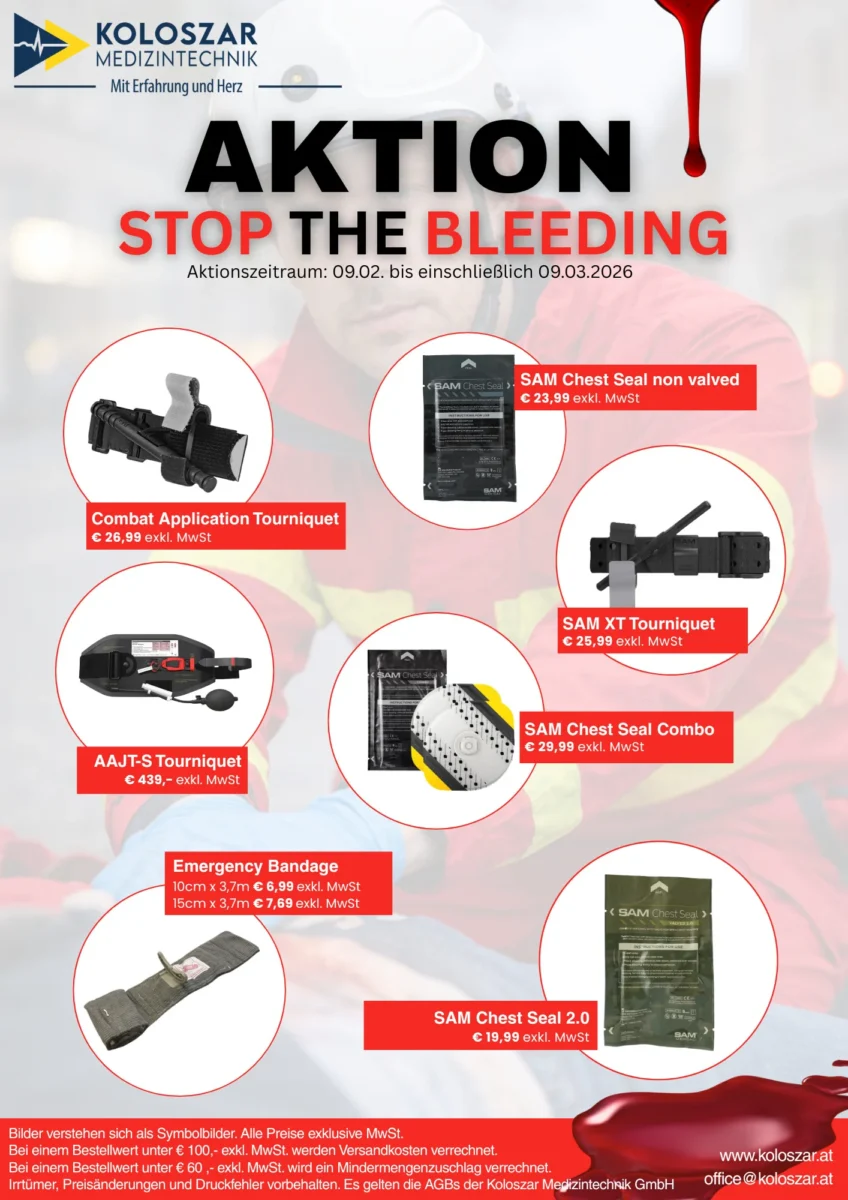 Vom 09. Februar bis einschließlich 09. März 2026 erhalten Sie ausgewählte, einsatzerprobte Produkte zur Blutungskontrolle zum Aktionspreis – entwickelt für den professionellen Einsatz im Rettungsdienst und unter realen Einsatzbedingungen bewährt.